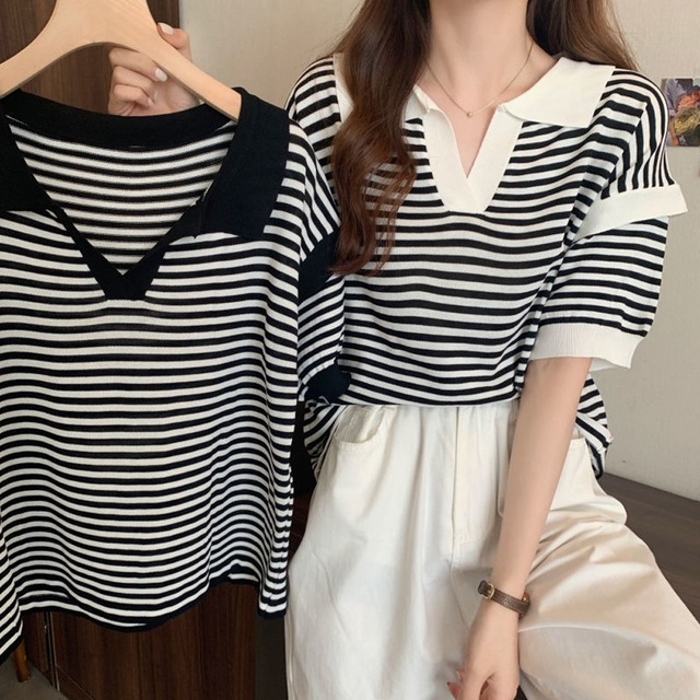 ニットtシャツ 薄手サマーニット 5分袖Vネック 襟付きカットソー ボーダー柄トップス カジュアル夏服 黒 ニットトップス 着やせニットお洒落 ニットポロシャツ夏 大人シックなモノトーンボーダーの色合い、デリケートな女性の肌を優しく包み込むしなやかなニット生地ポロシャツ Vネックと襟付きのデザインは小顔見せ、少し長めの半袖にラッフル袖加工を加え、シンプルでもトレンド要素をプラス スカートの甘さとパンツの辛さをうまく中和、ボトムス問わずベーシック仕様でもコーディネートの主役となるアイテム 素材:レーヨン89%+ナイロン11% カラー:ブラック/ホワイト サイズ:ワンサイズ 着丈:約53cm 肩幅:約51cm 袖丈:約17cm ゆき:約42.5cm 身幅:約50cm 胸囲:100-130cm 裏地:なし 伸縮性:あり 透け感:なし 生産国:中国 ※すべて平置きサイズです(採寸方法違いより、多少の誤差がございますので、ご了承ください)。 ※海外輸入品のため、商品の細部仕様は多少異なる場合がございます。予めご了承の上、ご注文お願い致します。 ※商品はお取引先様より直送になります。 ご注文後のキャンセル及び良品の返品はできませんので、予めご了承ください。