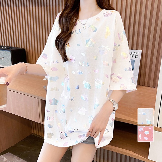 英字ロゴ オーロラホログラムTシャツ オーバーサイズ おしゃれゆったり ビッグtシャツ ロングtシャツ 体型カバートップス 可愛い夏服 20代 カジュアルtシャツ きらきら輝くコロンっと丸っこいキャラ絵と英字ロゴが可愛さとお洒落感をもたらし目を引く大きいサイズtシャツ 女性らしいラウンドネック、ウエスト周りとヒップ周りをカバーする丈感、少し長めの袖丈で気になる二の腕も隠してくれる 存在感ある主役級アイテムなのでシンプルボトムスとの相性が抜群、普段着としてもラウンジウエアとしても◎ 素材:ポリエステル85%+綿15% カラー:ホワイト/ピンク サイズ:ワンサイズ(XXL) 着丈:約76cm 肩幅:約58cm 袖丈:約24cm ゆき:約53cm 身幅:約62cm 胸囲:約124-140cm 裏地:なし 伸縮性:ややあり 透け感:ホワイトのみややあり 生産国:中国 ※すべて平置きサイズです(採寸方法違いより、多少の誤差がございますので、ご了承ください)。 ※海外輸入品のため、商品の細部仕様は多少異なる場合がございます。予めご了承の上、ご注文お願い致します。 ※商品はお取引先様より直送になります。 ご注文後のキャンセル及び良品の返品はできませんので、予めご了承ください。