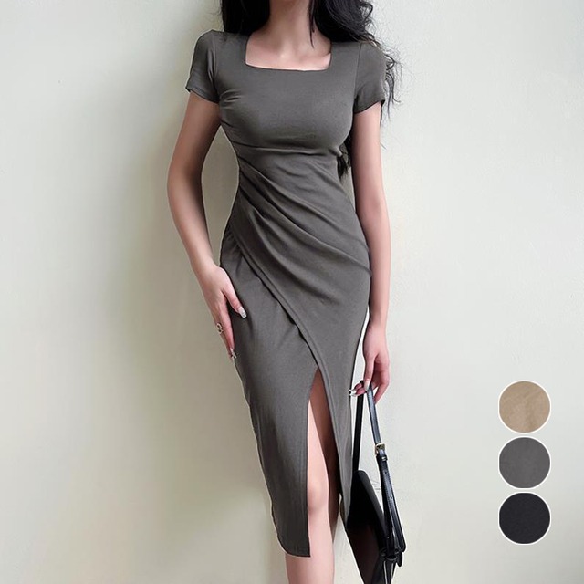 レディース スリット スクエアネック スリムフィット ギャザー 夏 薄手ワンピース セクシー大人 細見えワンピ ハイウエストワンピ 新作人気ワンピース パーティードレス タイトなシルエットでボディラインを美しく見せてくれる半袖ワンピース。 旬のスクエアネックがデコルテを女性らしい印象に。 スリット入りで歩きやすいのはもちろん、大人でセクシーな印象にも仕上げてくれる。 アクセサリーやバッグなどの小物と合わせて、パーティーやデート、二次会、発表会などにもおすすめ。 素材:ポリエステル80%+綿20% カラー:ブラック/チャコールグレー/モカベージュ サイズ:L/XL [L]総丈:約100cm 肩幅:約36cm 袖丈:約13cm ゆき:約31cm 身幅:約35cm 胸囲:約70-102cm ウエスト:約62-94cm ヒップ:約72-102cm [XL]総丈:約101cm 肩幅:約38cm 袖丈:約14cm ゆき:約33cm 身幅:約37cm 胸囲:約74-106cm ウエスト:約64-96cm ヒップ:約76-106cm 裏地:なし 伸縮性:あり 透け感:なし 生産国:中国 ※すべて平置きサイズです(採寸方法違いより、多少の誤差がございますので、ご了承ください)。 ※海外輸入品のため、商品の細部仕様は多少異なる場合がございます。予めご了承の上、ご注文お願い致します。 ※商品はお取引先様より直送になります。 ご注文後のキャンセル及び良品の返品はできませんので、予めご了承ください。