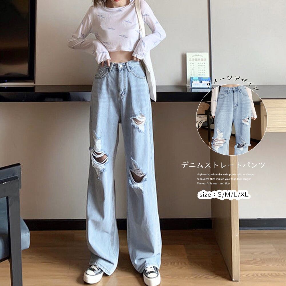 クラッシュデニム ボトムス10代春夏 美脚パンツ 風