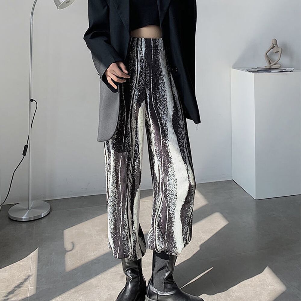 滑らかな肌触りでシワになりにくく、着心地も良いニュアンス柄ロングパンツ