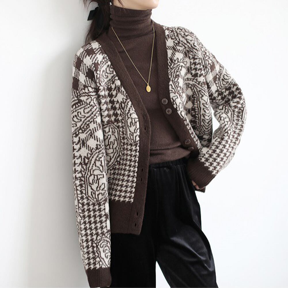 ジャガードカーディガン 長袖 ニットアウター 着やせ 前開き ニットセーター オシャレ 羽織り 春秋冬