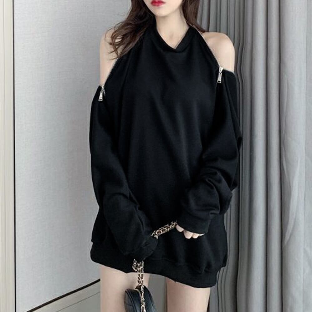 ZIPデザインが目をひくオフショルダー長袖トップス。