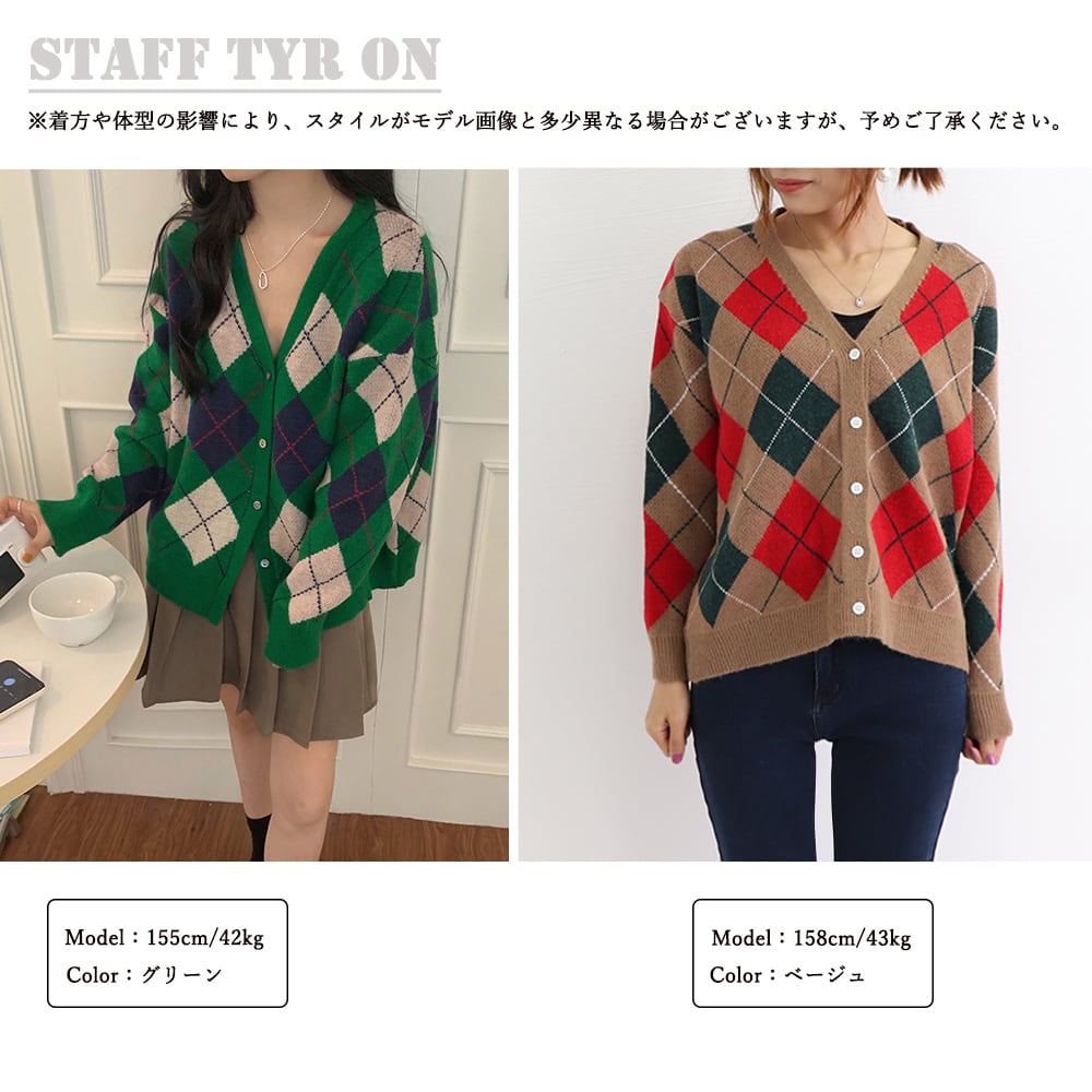 女性らしい綺麗なシルエットを演出してくれるアーガイル柄カーディガン。