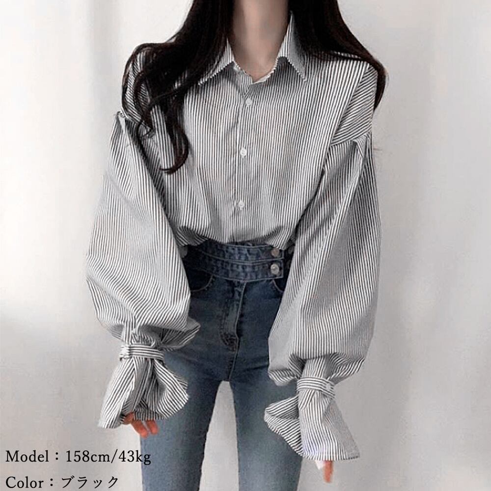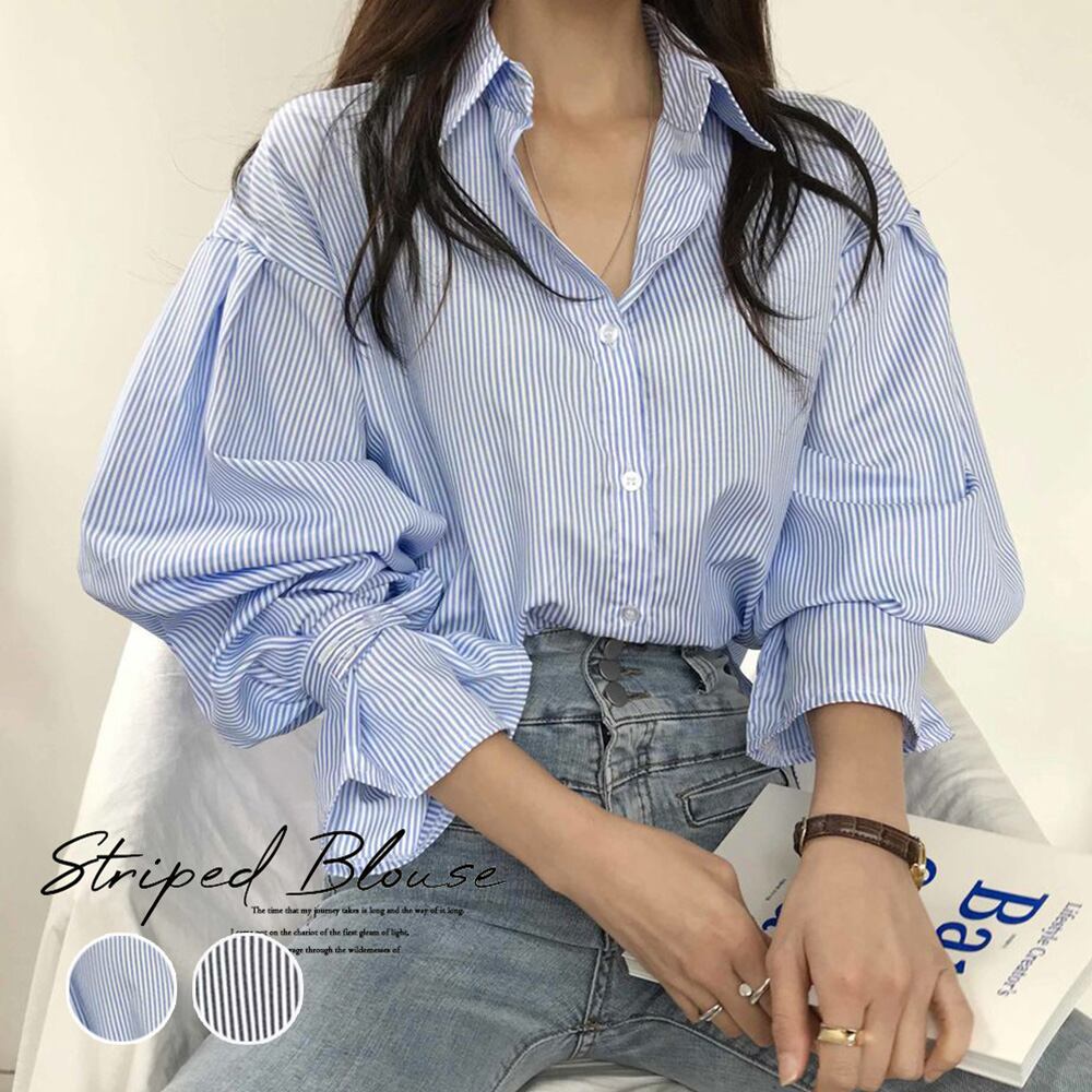 ボリューミーなキャンデースリーブが女性らしい華奢な印象に見せてくれるストライプ柄シャツ