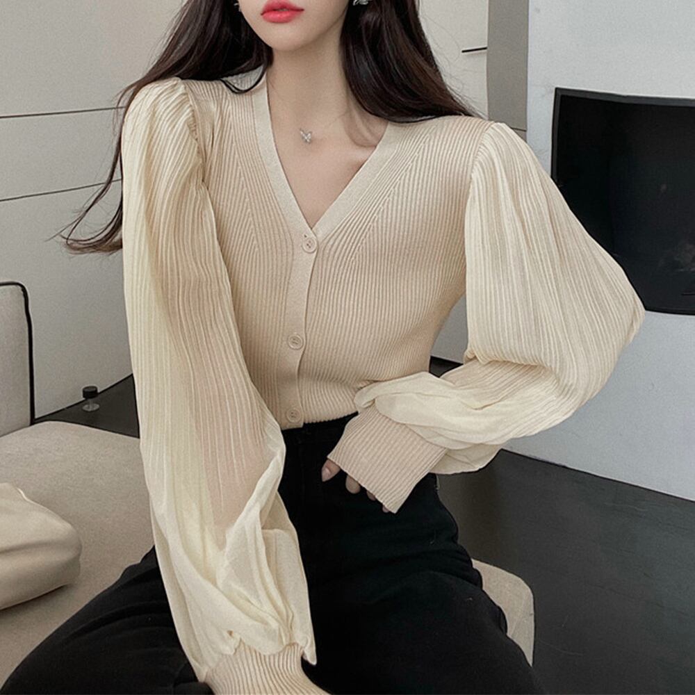 落ち感のある大人可愛さを演出する前開きランタンスリーブニットカーディガン。
