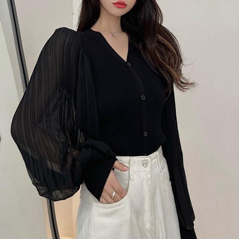 レディース ニットブラウス 異素材 切り替え トップス ランタンスリーブ 羽織 前開き 無地 こなれ感 ブラウス 通学