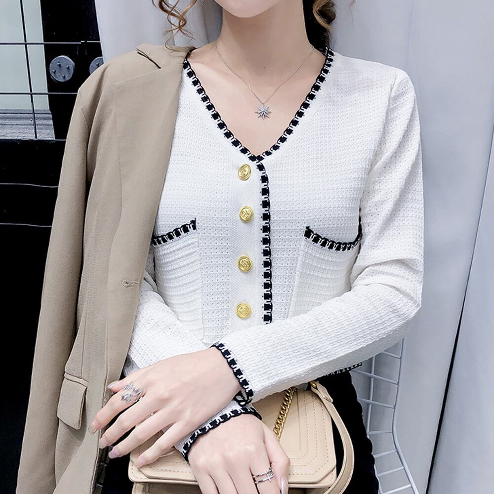 レトロな柄が端に編まれたデザインがアクセントになったニットカーディガン。