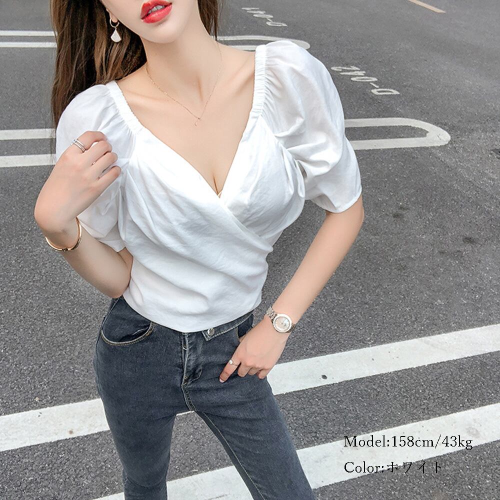 トップス シャツ パフスリーブ バックリボン 無地 ショート丈 おしゃれ オフィス
