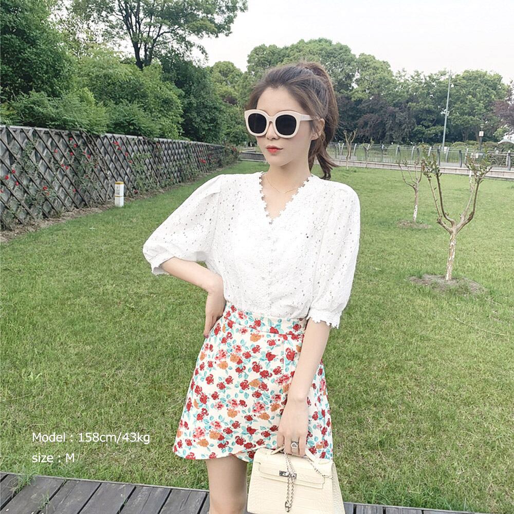 半袖 パフスリーブ 柄レース トップス 夏サマー おしゃれ シャツブラウス きれいめ 透け感 カジュアル ショート オフィス 通勤 ボリューム袖