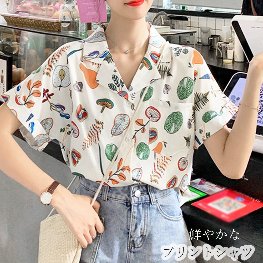 柄シャツ 半袖 トップス レディース オシャレ 可愛い サラリ 夏 薄手 前開きトップス カットソー