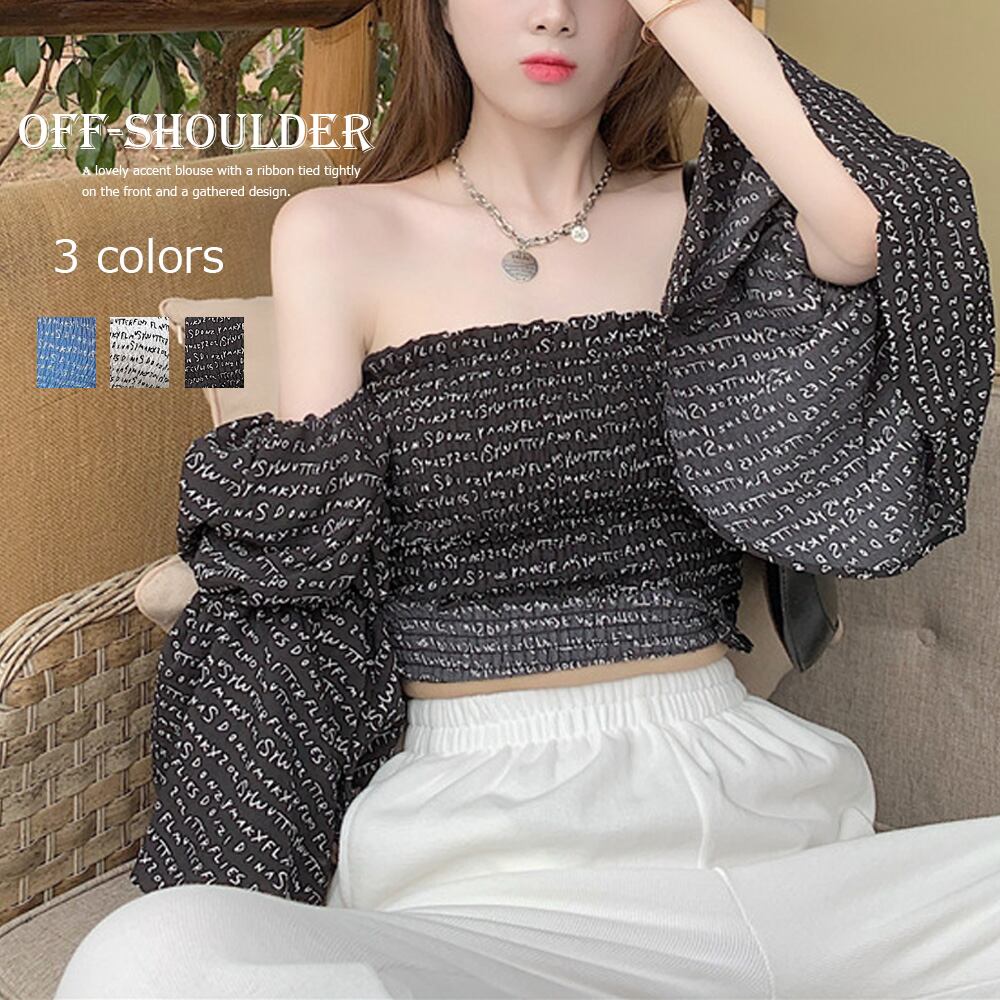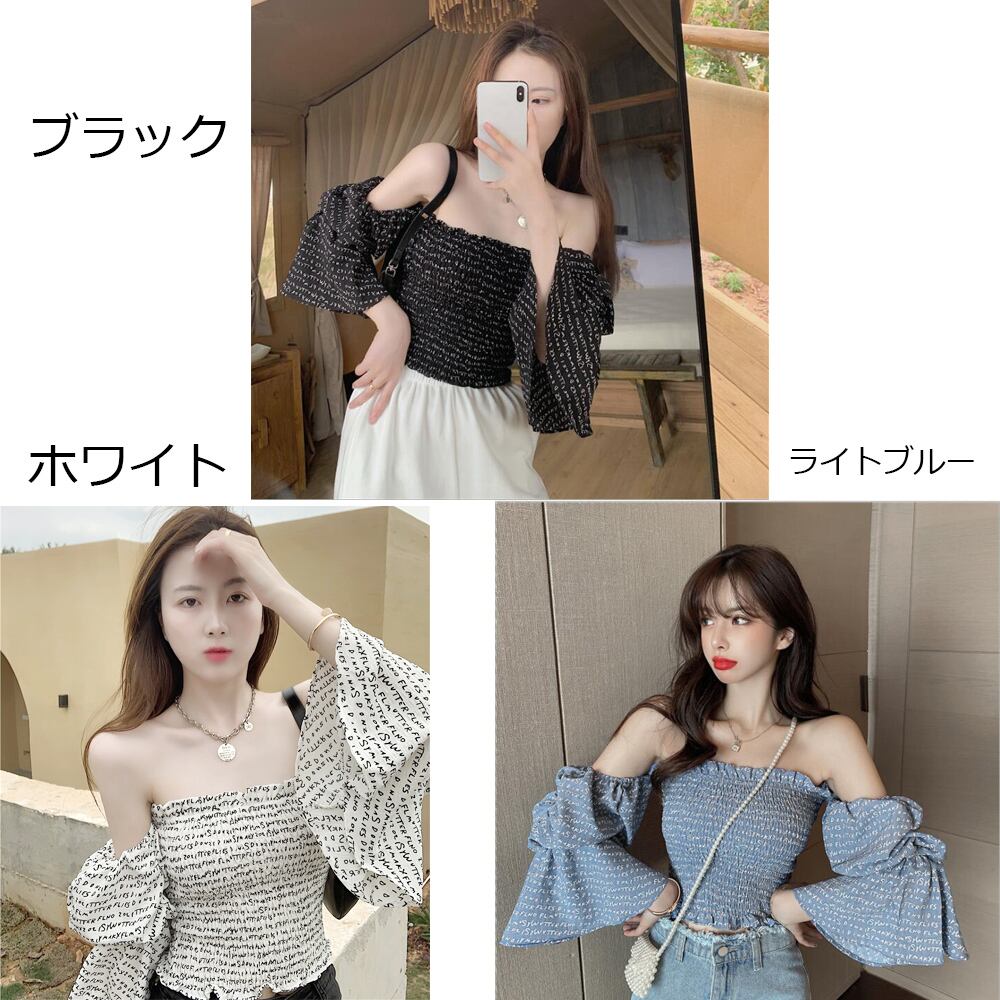 レディース 夏 英字柄 ギャザー シフォン ブラウス きれいめ 半袖 フェミニン デコルテ 夏サマー パフスリーブ 薄手 カットソー