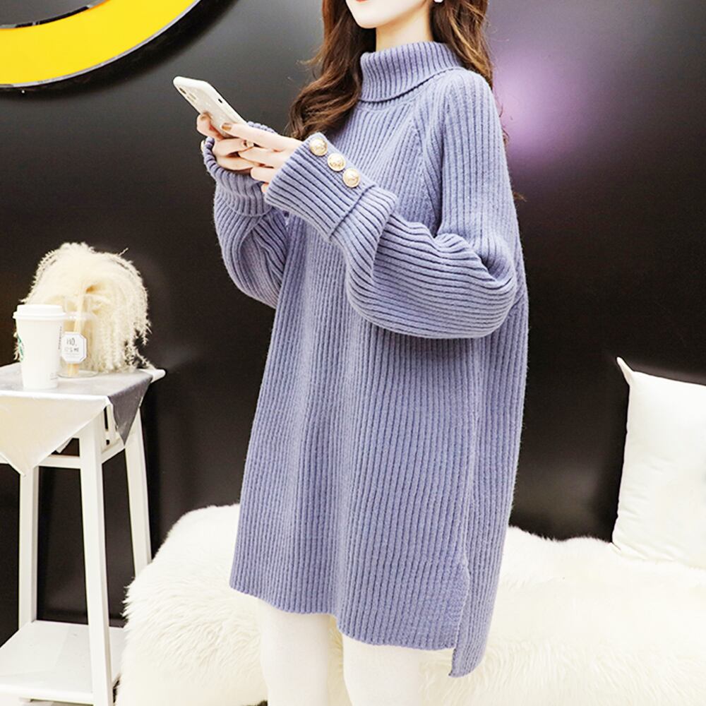 ニットトップス レディース ハイネック あったか セーター 冬 スリット入り 無地 女子会 長袖 ボタン飾り