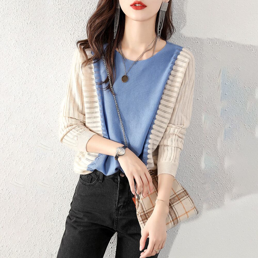 レディース バイカラートップス 長袖 透かし編みニット カジュアル ニットセーター 切り替え 着やせ
