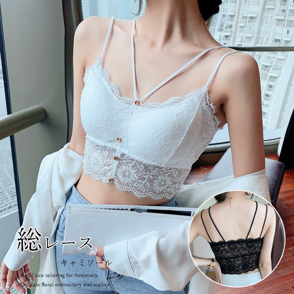 カップ入りVストラップデザイン総レースハーフキャミソール