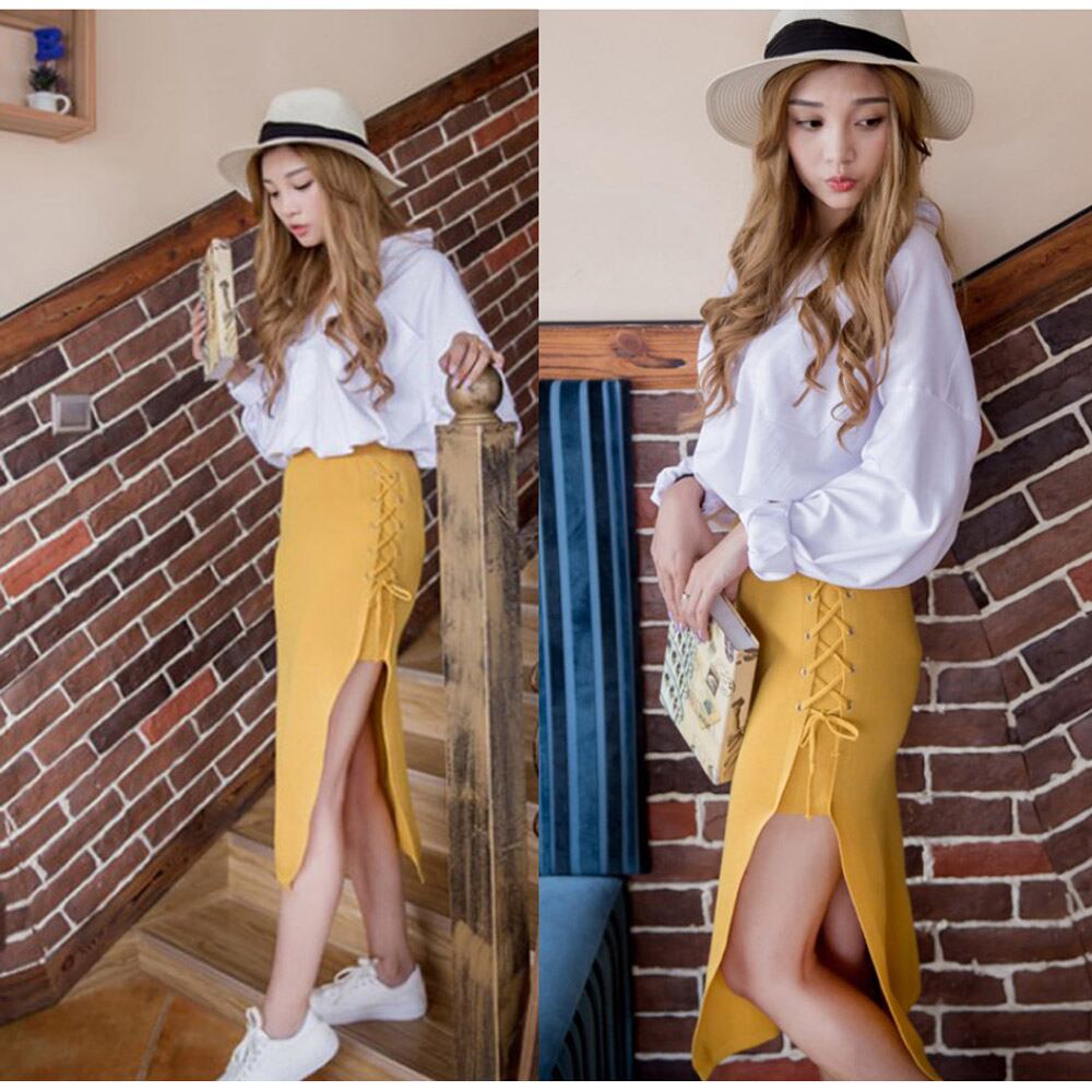 レディース ニットスカート タイト ハイウエスト レースアップ