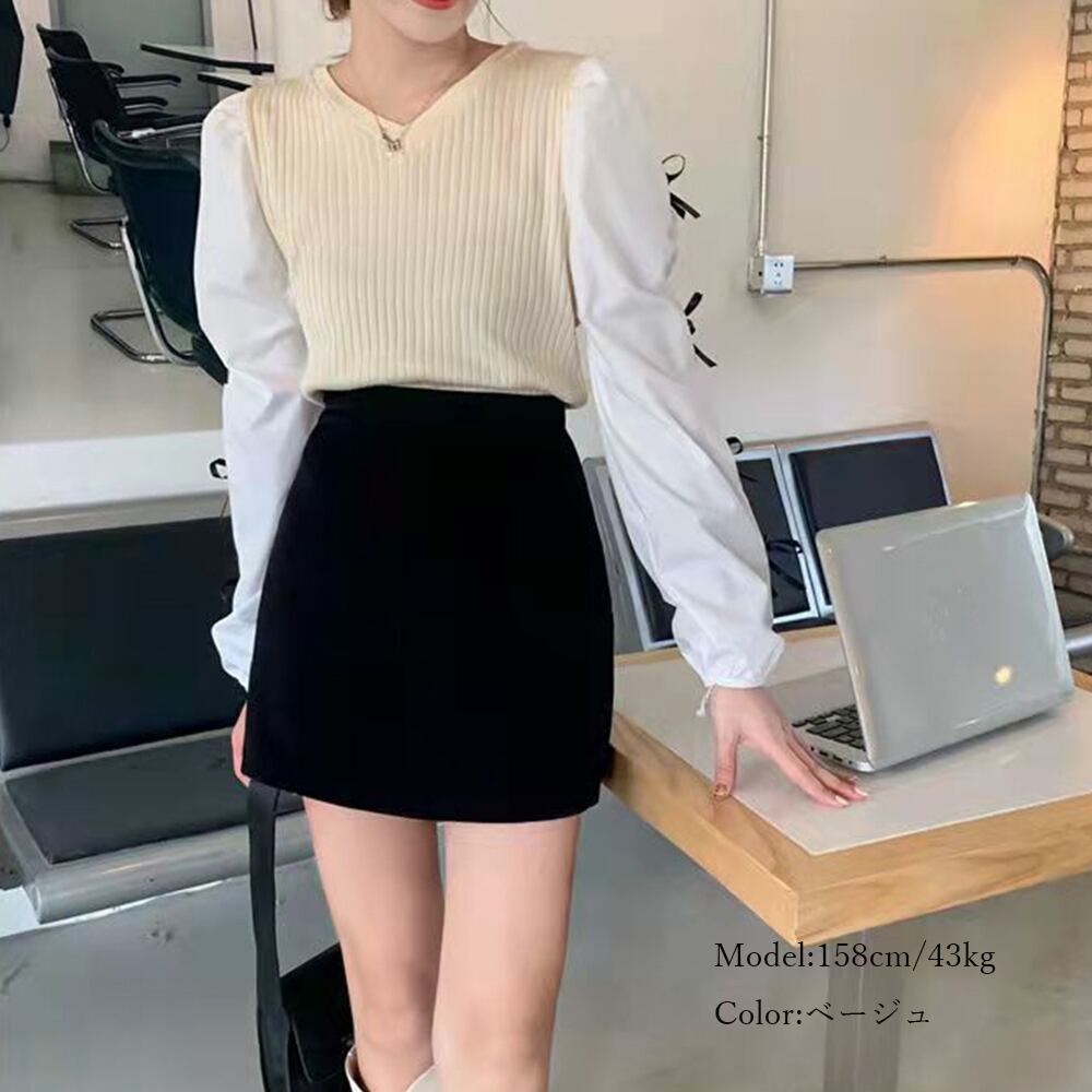 ニットソー レディース ボリューム袖切り替えニット 異素材 トップス お洒落 リブニット 長袖
