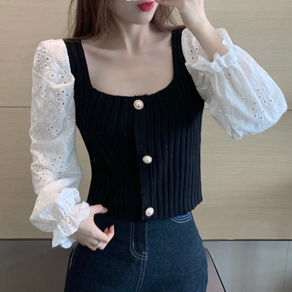 ボリュームのあるレース素材の袖がキュートな印象を与えてくれるニットトップス
