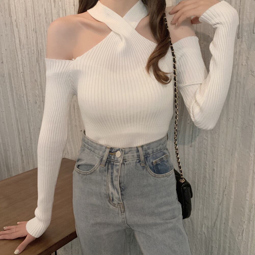 首元のクロスデザインに大胆な肩開きが大人っぽいニットトップス