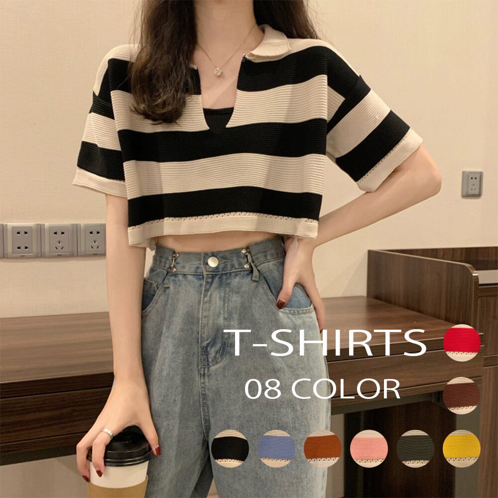 セクシー トップス 夏ニット ボーダー柄 プルオーバー トップス へそ出し ニットリブ ショット丈 ニットソー