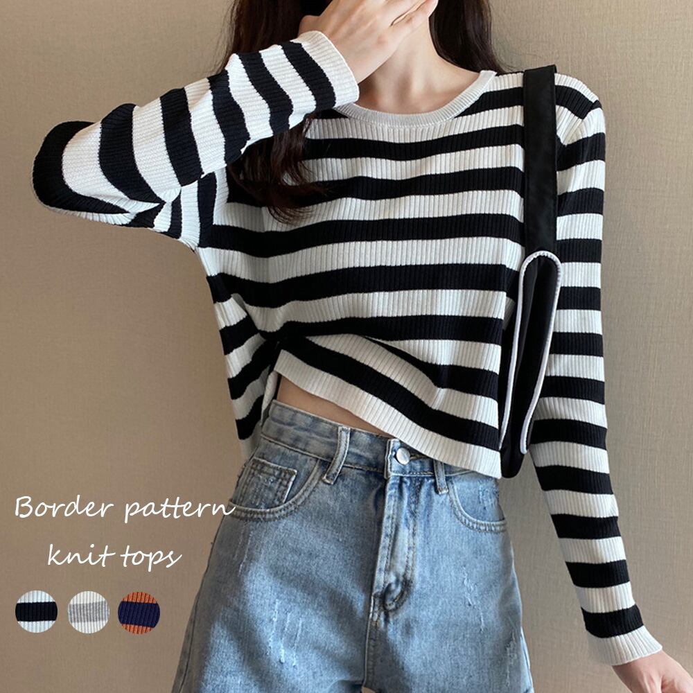 薄手ニット生地で優しい肌触りを与える、ボーダー柄のデザインもレトロなお洒落感を演出するニットトップス