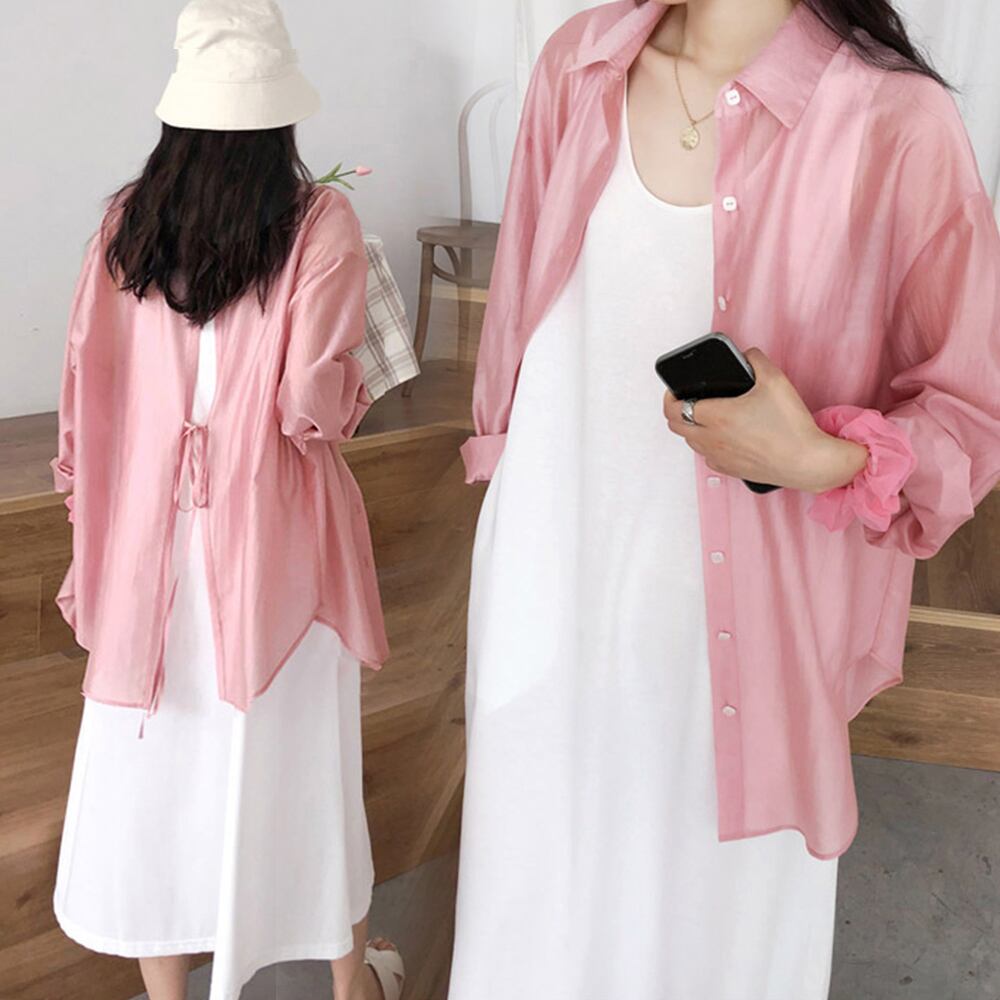 薄手 シアーカーディガン 光沢感 バックスリット シャツ 無地 トップス 透け感 羽織 長袖 シースルーシャツ