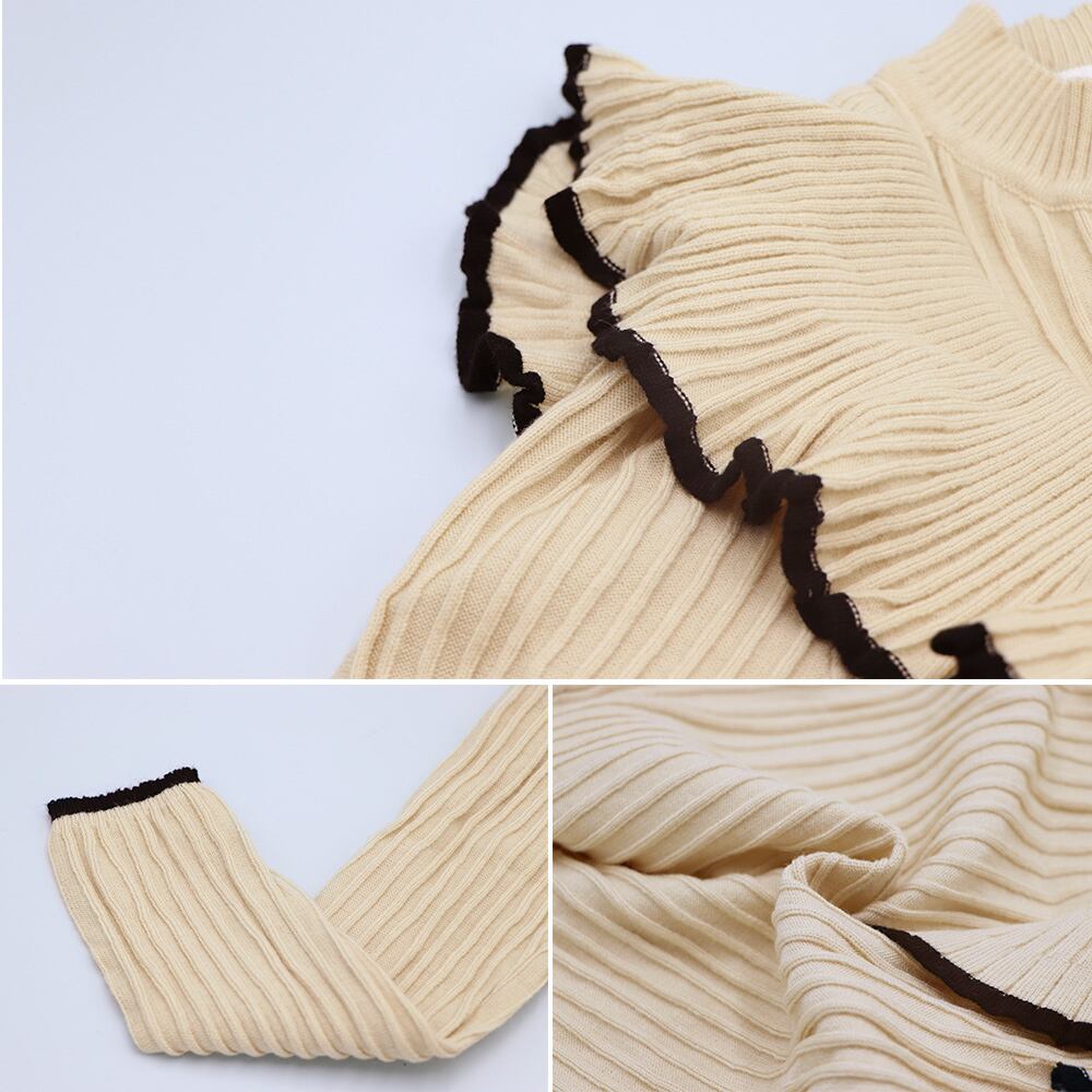 肩周りフリルのデザインが可愛くて、よい厚みのリブニット素材で暖かく、ロングシーズン活躍