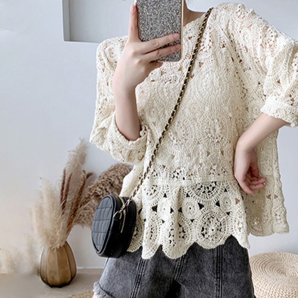 程よい肌の透け感が涼しげな可愛い透かし編みトップス