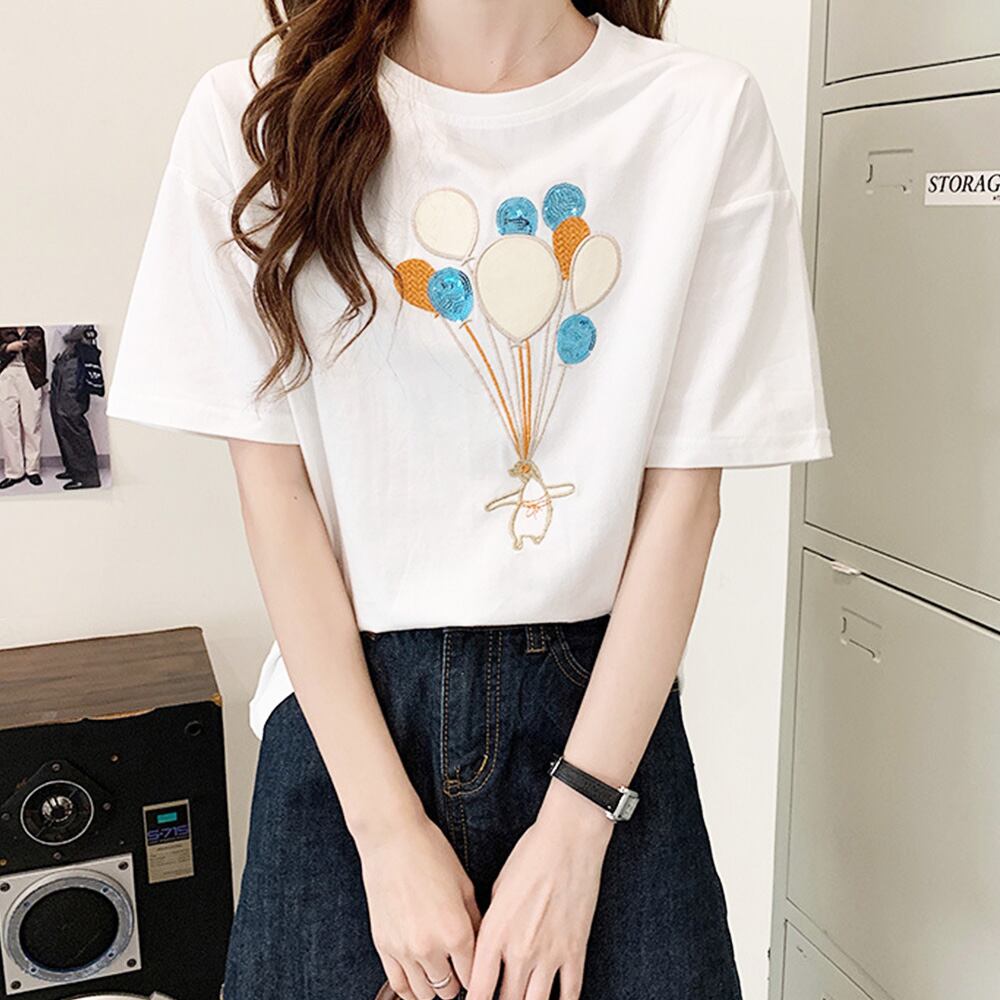 フロントに風船刺しゅう入りデザインが可愛いシンプルなTシャツ