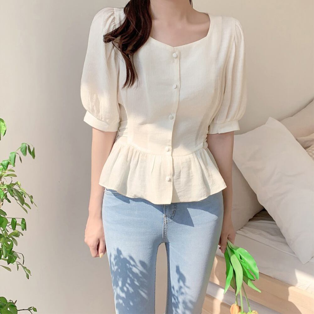 フロントボタンが品良く映えるアクセント、デコルテをすっきりと見せるスクエアネックブラウス