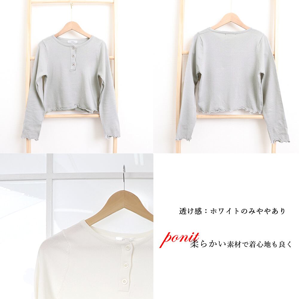 クルーネックにボダンが付き、さりげなく波型になった裾と袖口、程よくボディにフィットするシルエットが、可愛く女性らしさを演出してくれる。