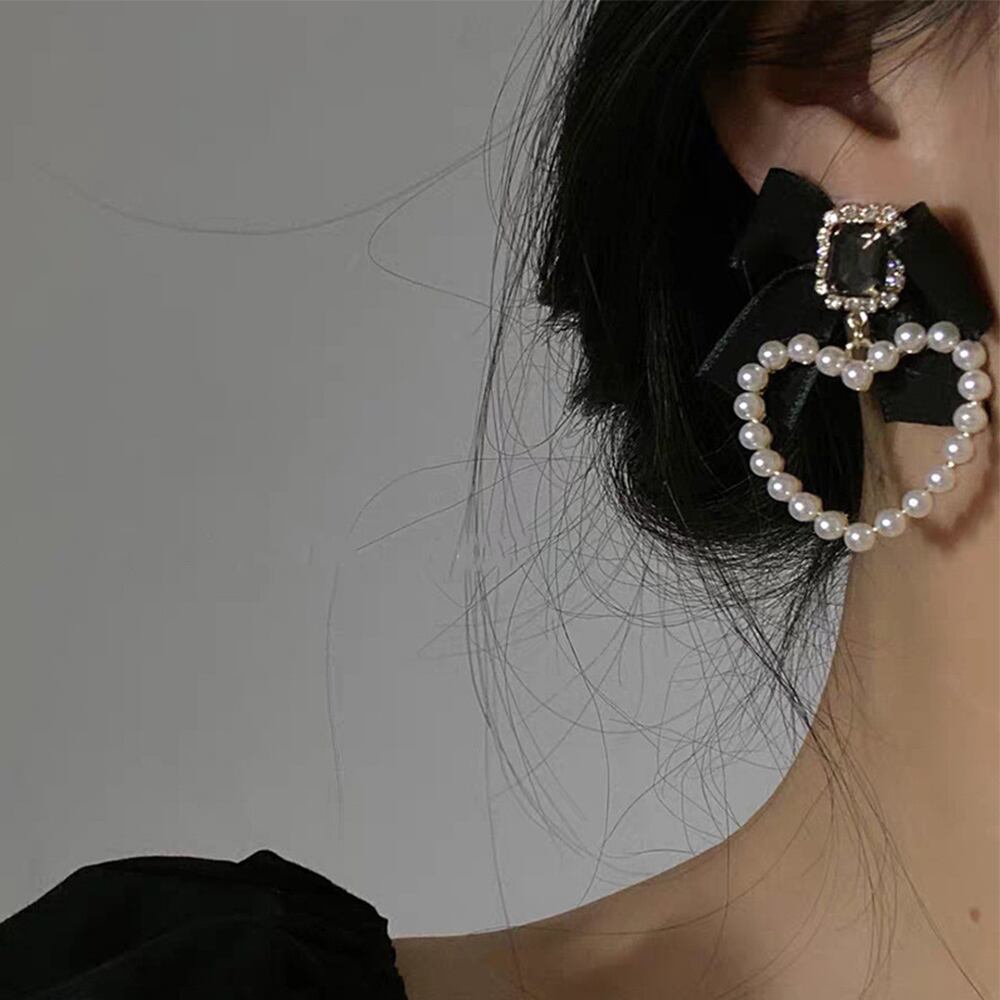 リボン付き、フェイクパールをハートモチーフにしたとても綺麗なピアス&イヤリング。