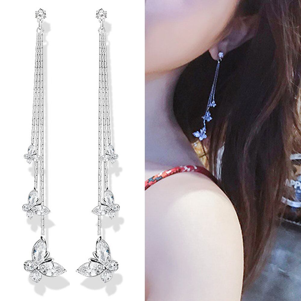 キラキラと輝きを放つ合金チェーンと蝶々モチーフラインストーンのロングピアス