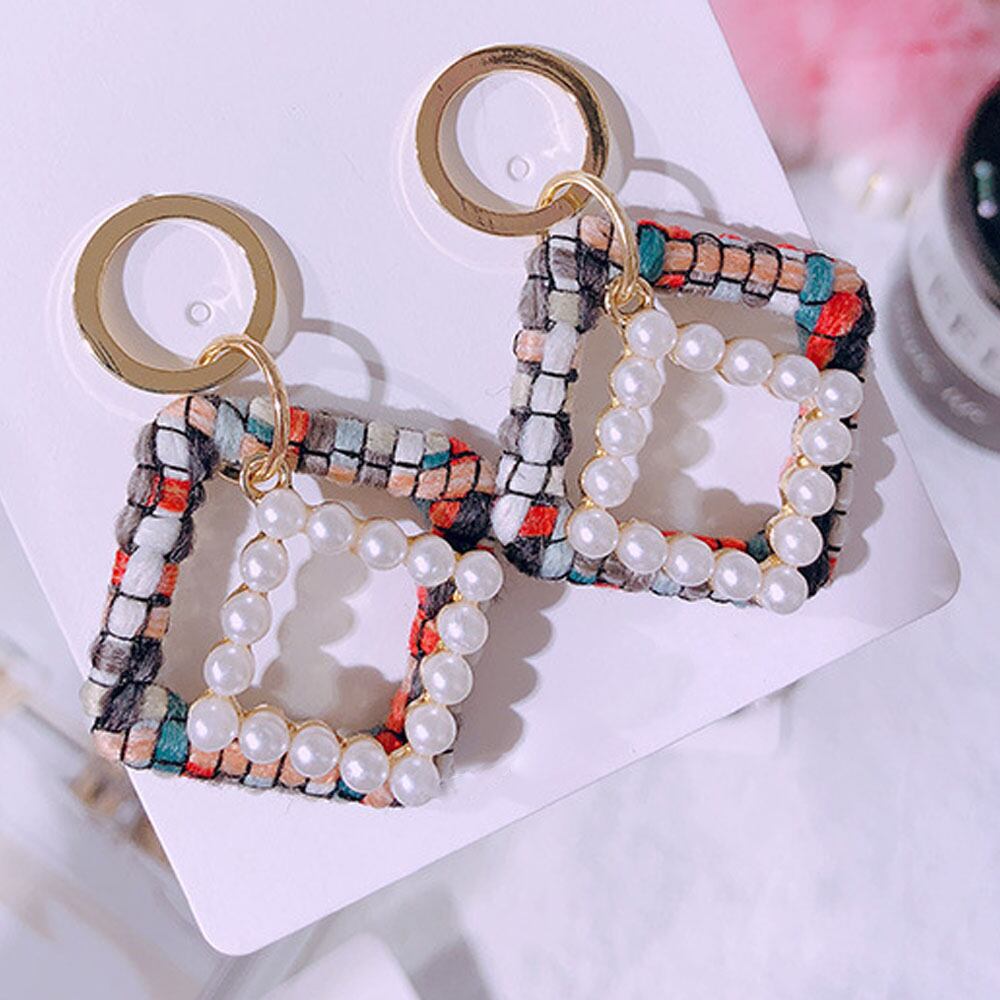 カラフルな糸の編み込みとフェイクパールのダブルスクエアリングピアス