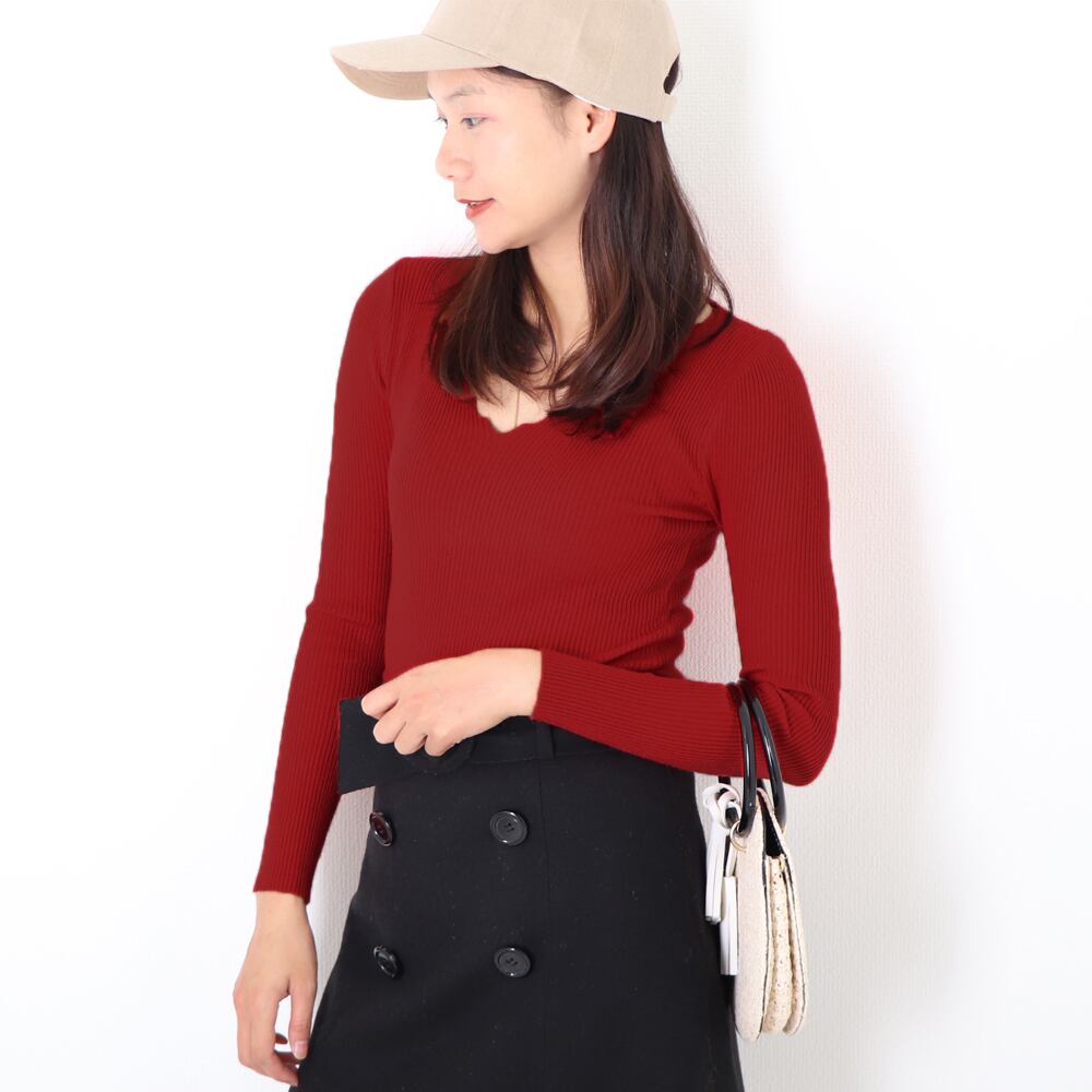 ギザギザ加工が施されてほかのVネックとひと味違うレディースタイトトップス