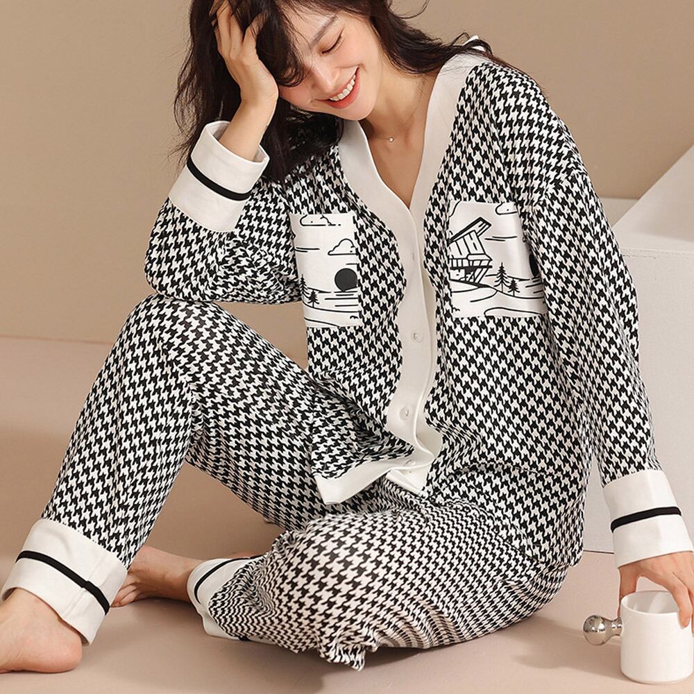 ガーリーなリボン、シックなニュアンス、モダンな千鳥、柄物なのにオトナ女子っぽいきれいめルームウェア