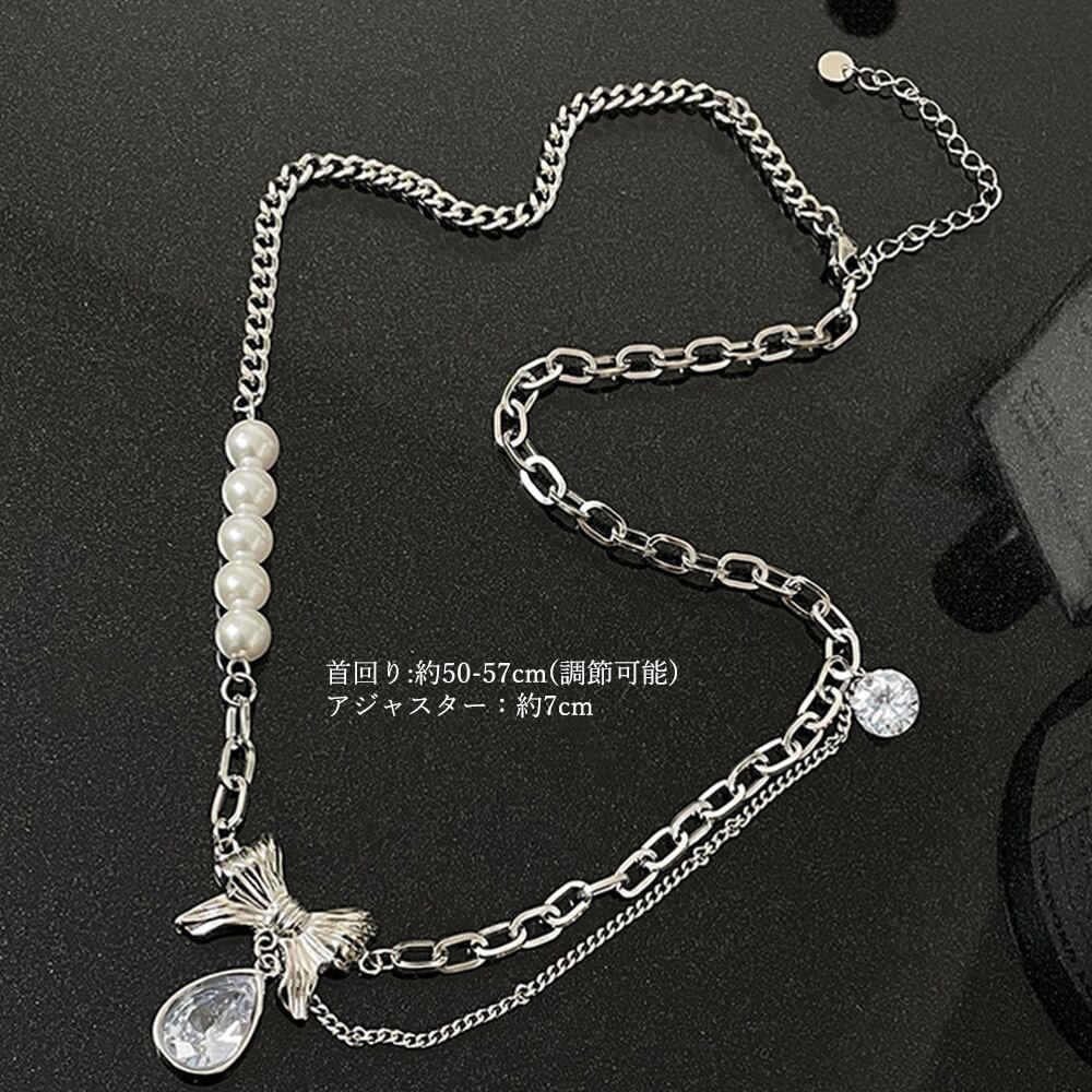蝶結びチェーンネックレス リボンモチーフ ダイヤモンド風 アクセサリー 非対称デザイン ジュエリー 可愛い