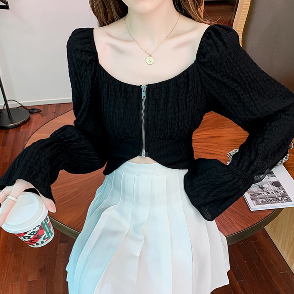 フロントファスナー ブラウス レディース スクエアネック シフォンシャツ へそ出し フレアスリーブトップス