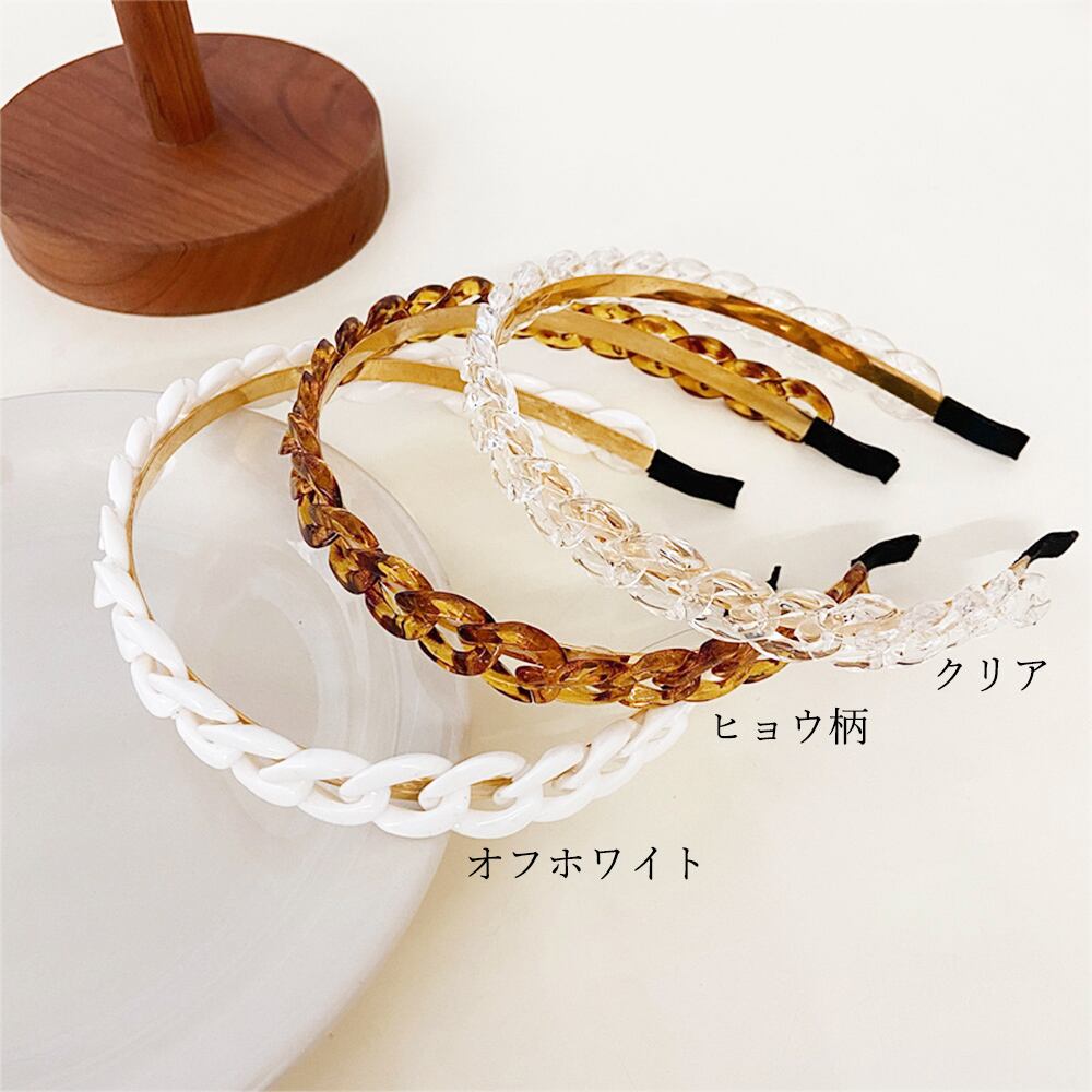 存在感のある太めのサイズ感で、いつもの髪型もつけるだけでぐっとオシャレに仕上げるアクリルチェーンモチーフのカチューシャです