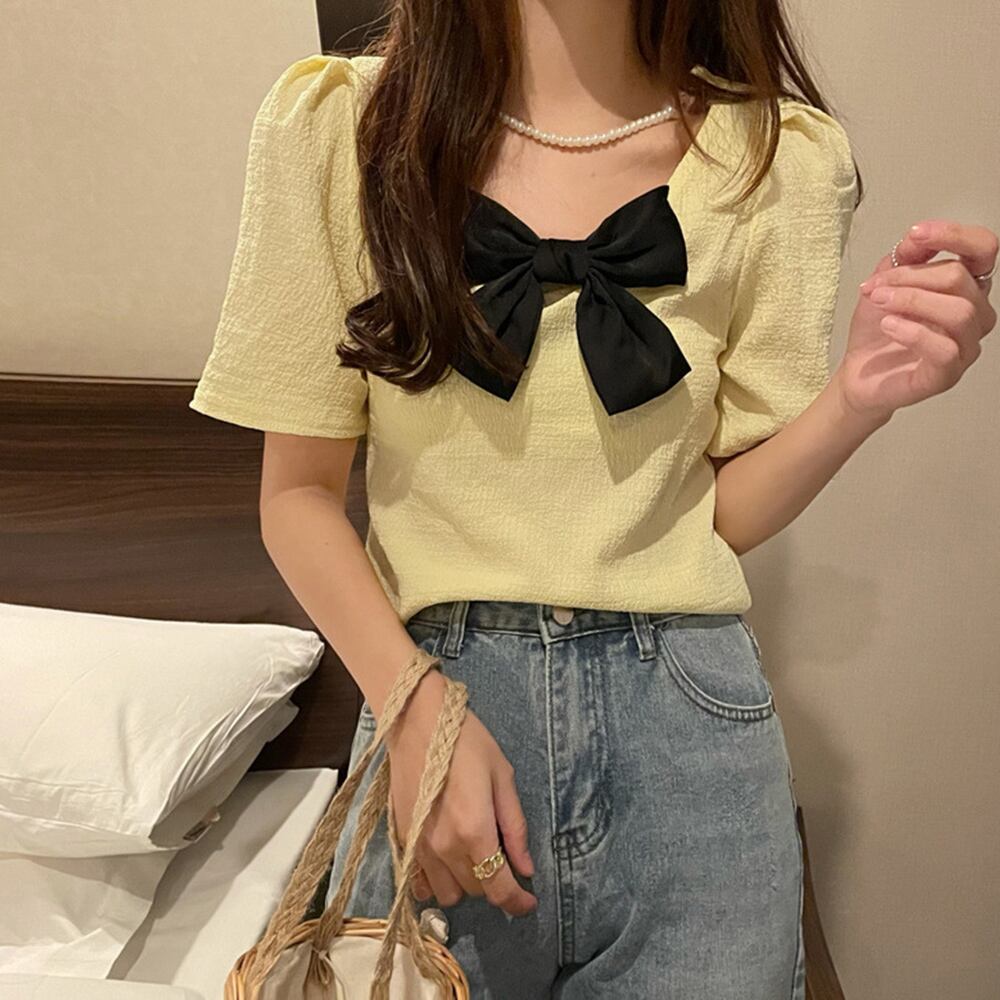 胸元に可愛く飾る大きなリボンと取り外し可能なパールネックレス付きのトップス
