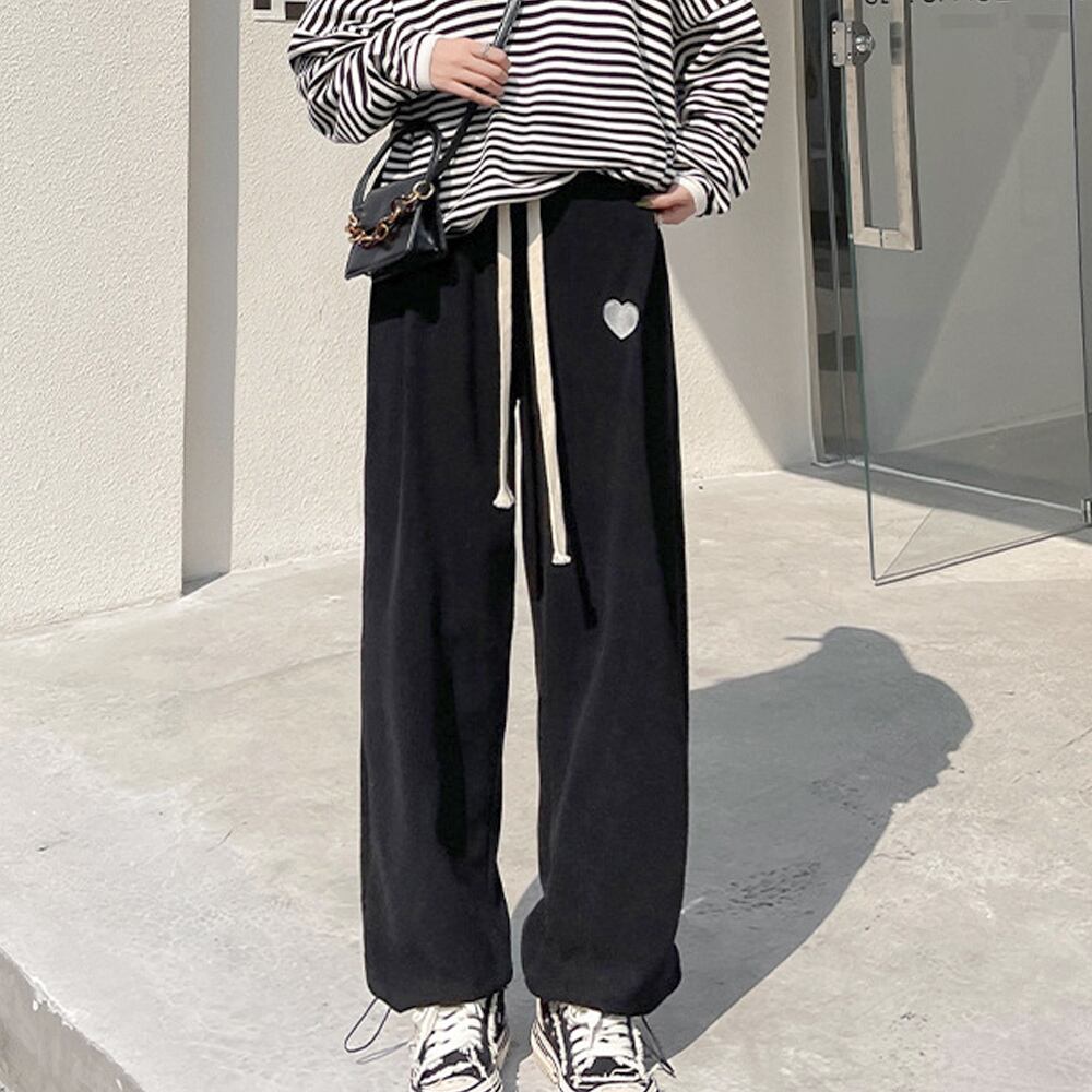 ボトムス ワイドパンツ ハイウエスト 刺しゅう トレーニング ウエストゴム 紐付き ランニング 部屋着 ゆったり
