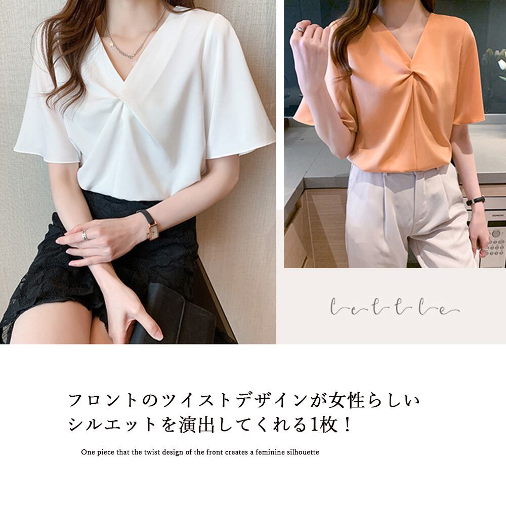フレア袖 レディース Vネック シフォンブラウス 薄手半袖 ねじり 通勤シャツ 無地 カジュアル トップス 着やせ 春夏