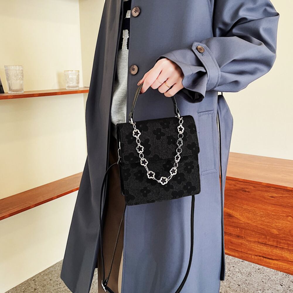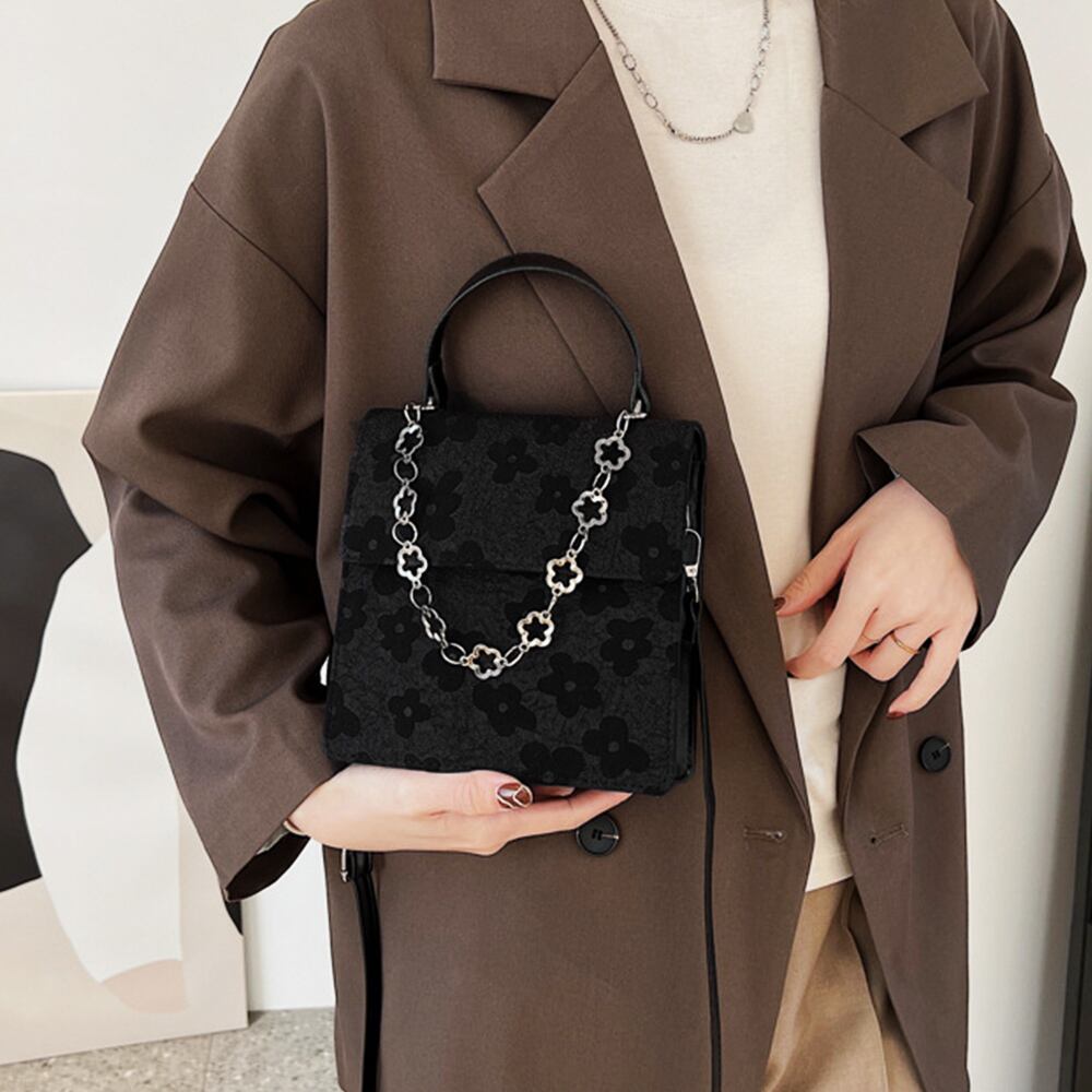 フラワーモチーフにしたチェーンは取り外し可能、持ち手としても可愛い