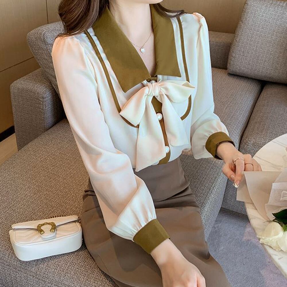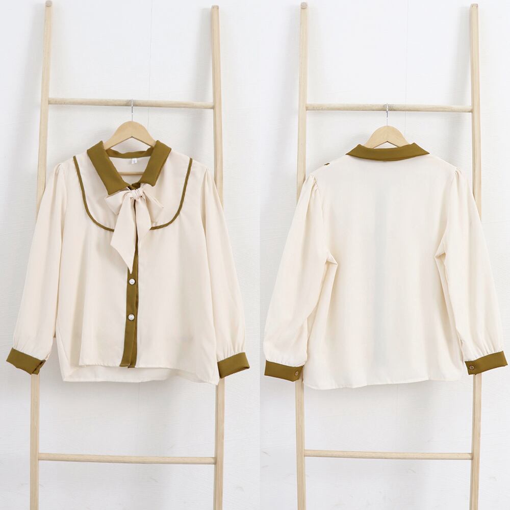 胸元を華やかに見せてくれるリボンタイが大人フェミニンなバイカラーのブラウスです