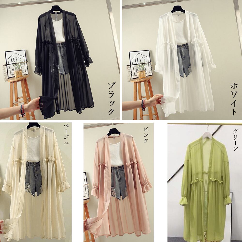 レディース ウエストギャザー ロングガウン UV対策 薄手 シアーカーディガン 七分袖ゆったり 紫外線対策トッパーカーデ