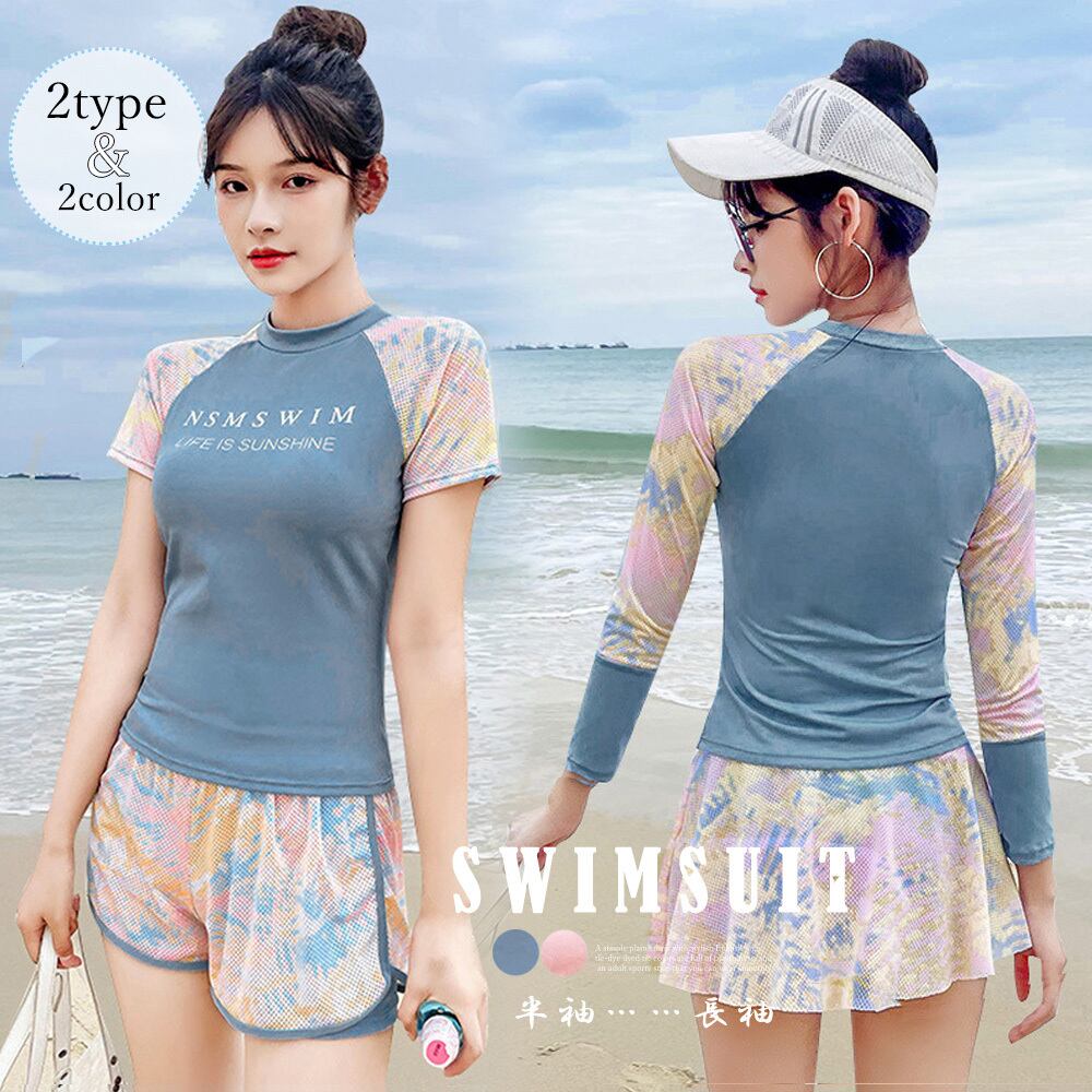 水着 フィットネス 水着 オトナ女子 半袖 長袖 ラッシュガード 上下セット かわいい 水着2点セットスイムウェア