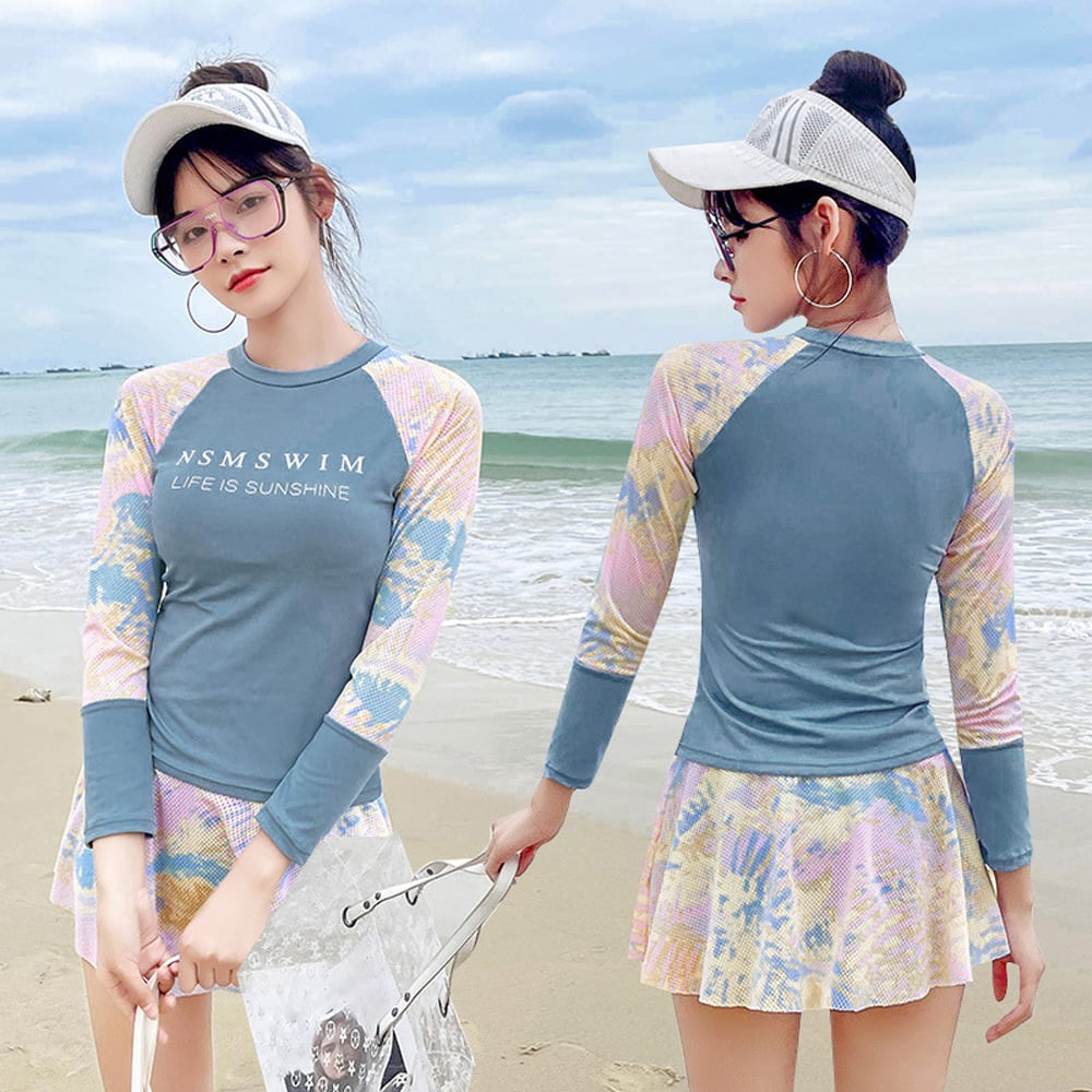 露出度が控えめで紫外線から肌を守ってくれるラッシュガード仕様の新作水着上下2点セット
