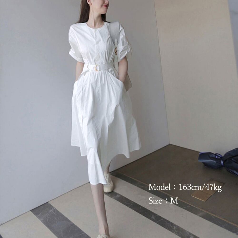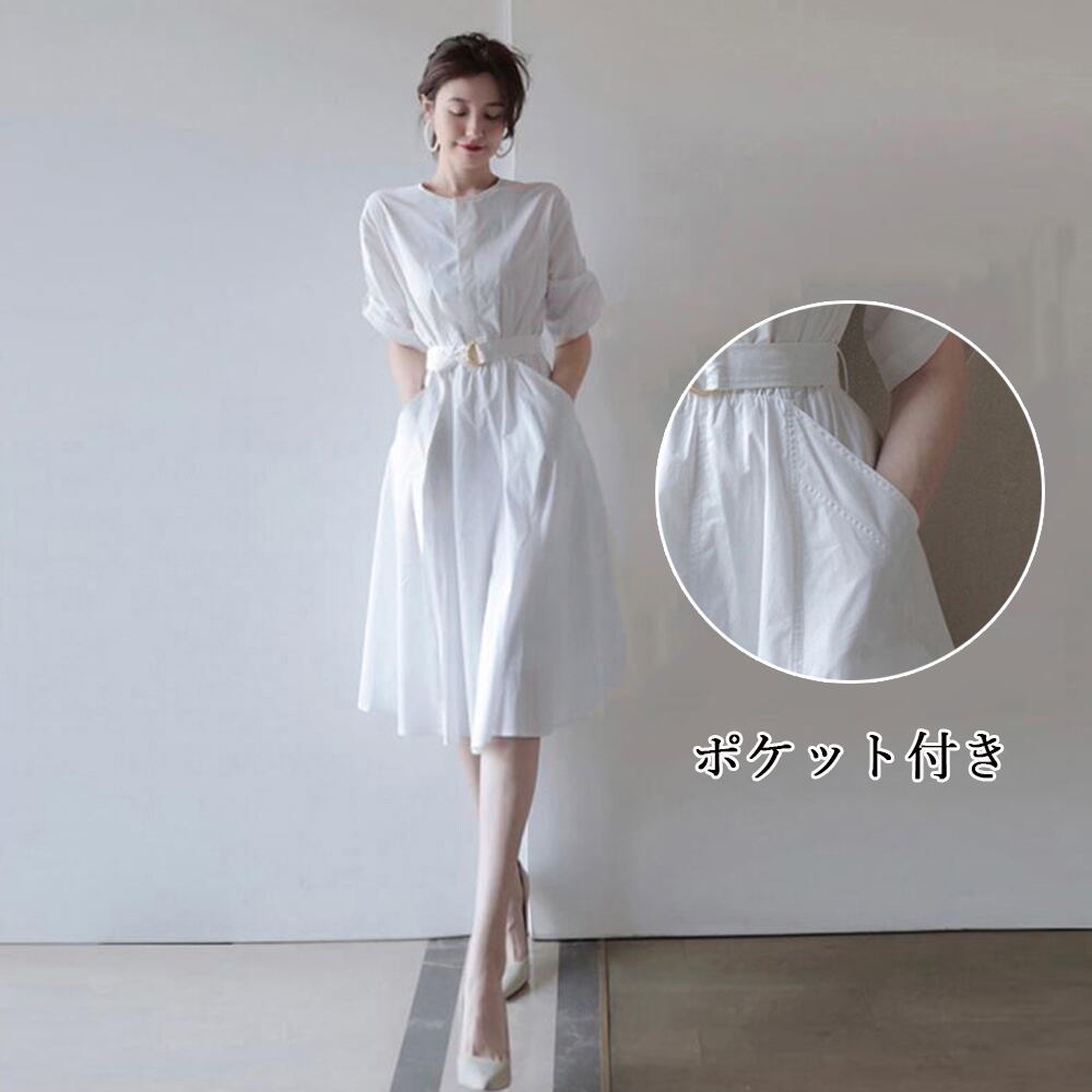 レディース Aライン 膝丈ワンピース白 ウエストマーク ポケット付き 夏ワンピース 上品 シンプル 無地ワンピ 通学通勤