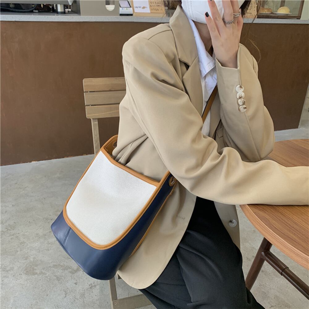 キャンパスショルダー PUレザー大容量 レディース バケットバッグ 大人上品 肩掛けカバン カジュアル bagナチュラル