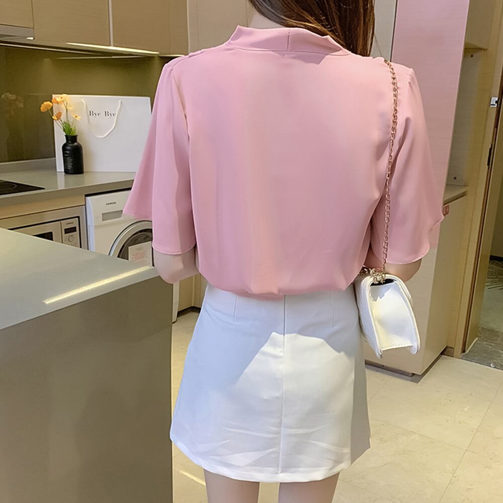 Vネック ラッフルスリーブ ブラウス オフィスカジュアル 大人夏服 きれいめ シャツブラウス 黒白トップス無地フェミニン